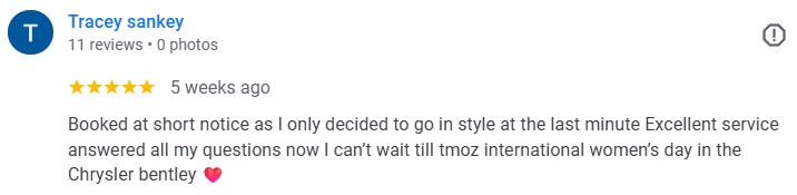 We were delighted to help Tracey arrange her booking for International Women’s Day and to make the process feel straightforward from the outset. At Limotek, we know that even a last-minute decision can still become a memorable luxury experience when the right support is in place behind the scenes.